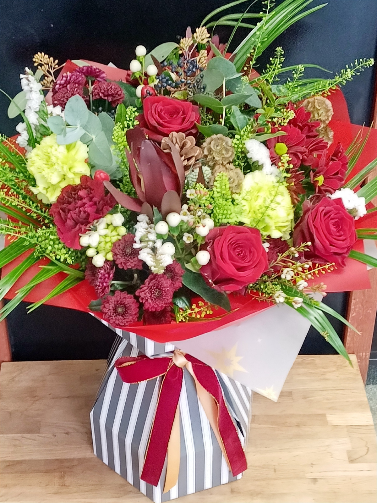 Bring some festive cheer into your home with our Christmas Wishes Bouquet. A stunning hand tied arrangement bursting with rich festive tones, seasonal foliage, and elegant touch of Christmas sparkle.This hand tied is sure to make a statement wherever it is displayed. Perfect as gift or as a center piece for your own holiday celebrations!