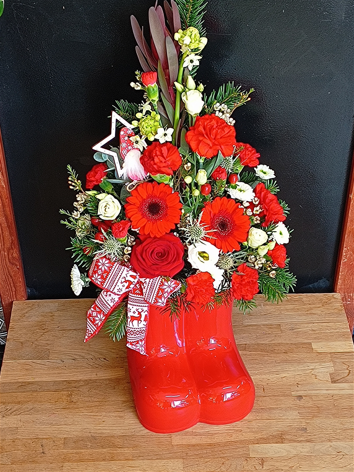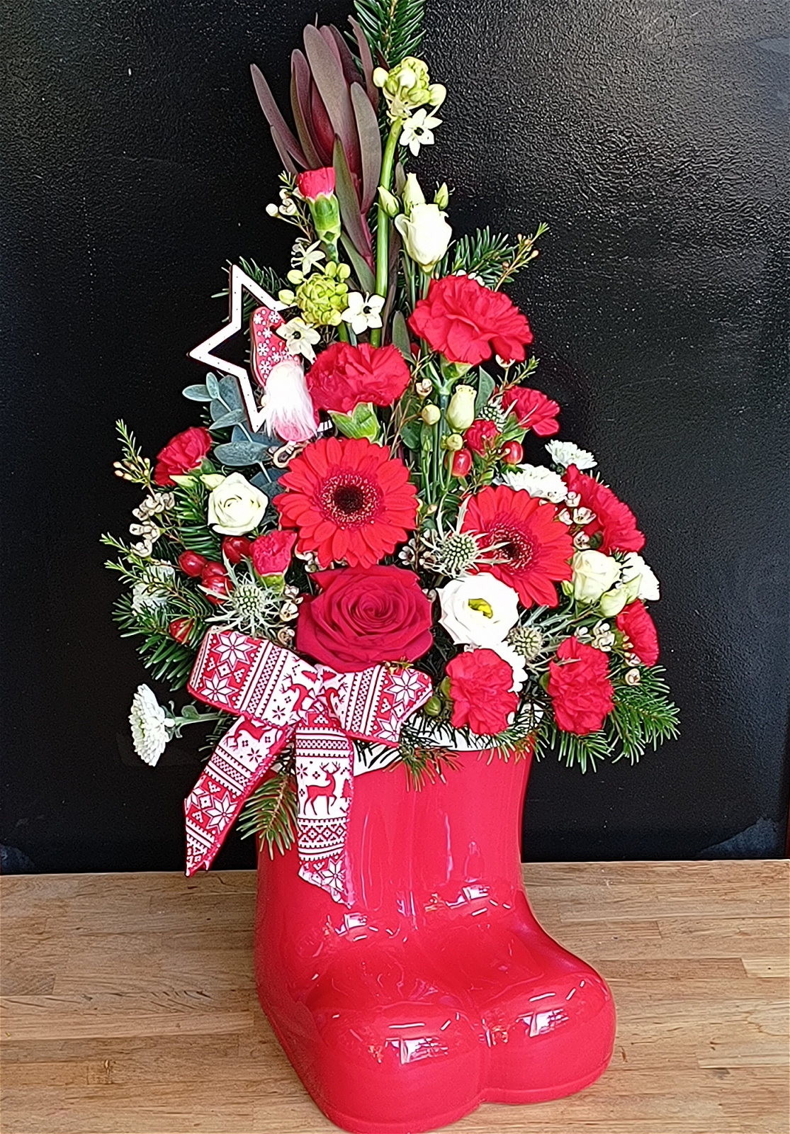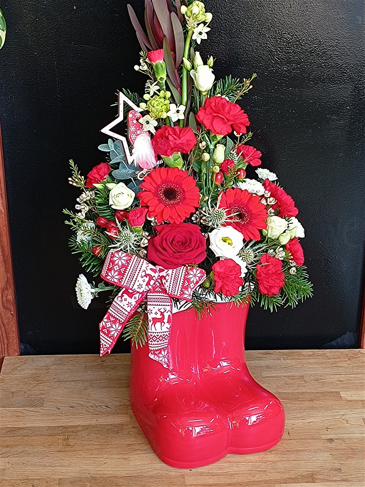 Introducing our limited edition this season, stunning eye-catching ceramic Santa's Boots arrangement brings festive cheer to your home.This pretty piece features vibrant red carnations, mini gerbera, spray carnations, red rose, scotch pine and finished with a festive pick and a ribbon.