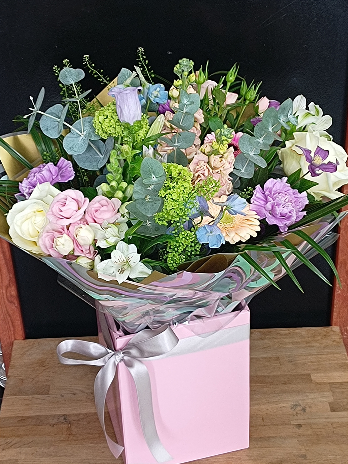 With its soft and delicate appearance, our Mamma Mia Hand Tied is a super gift idea. Full of fragrance and pastel colours, the arrangement includes Lisianthus, Delphinium, Roses, Stock, Snapdragon, Dianthus, Campanula and lush foliage.