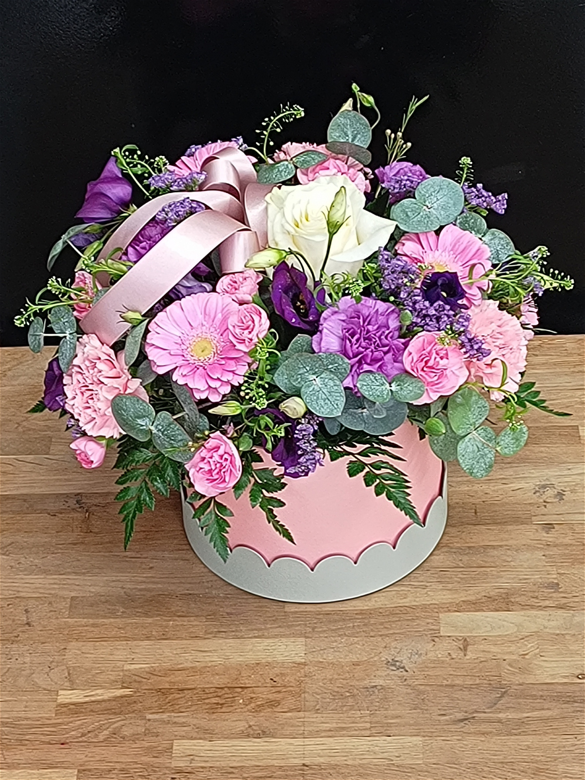 This beautiful modern arrangement in shades of pinks, white and purple made within an Oasis foam presented in a gorgeous hat box as shown.