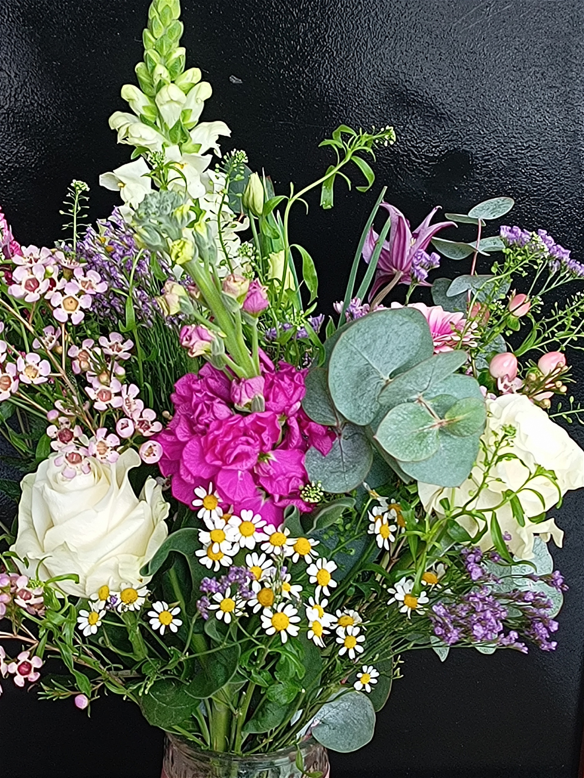 Embracing colour this arrangement is filled with fabulous Iris, Snapdragon, White Roses, Clematis, Tanacetum, Veronica, Germini, Eucalyptus and Thlaspi.
