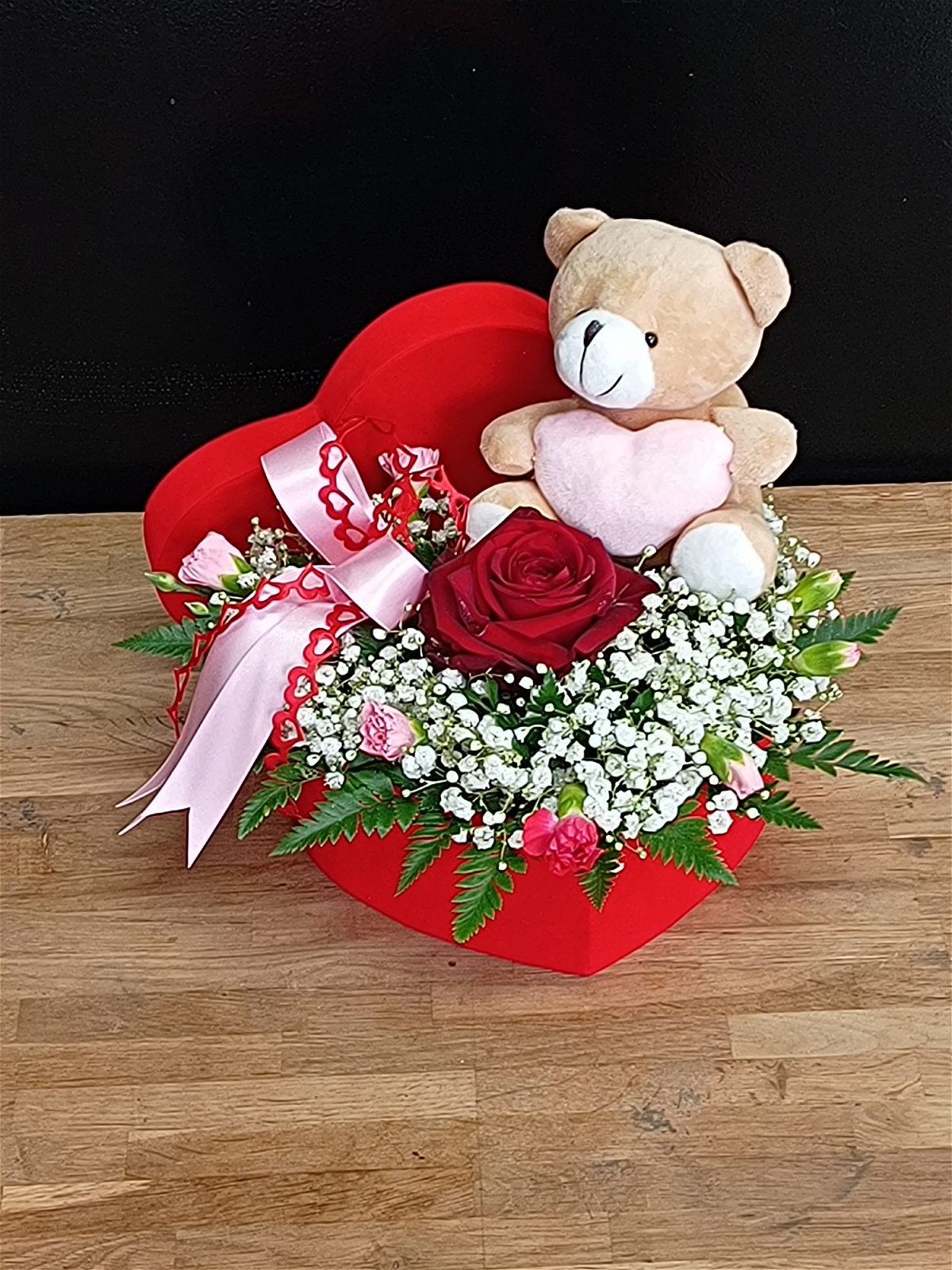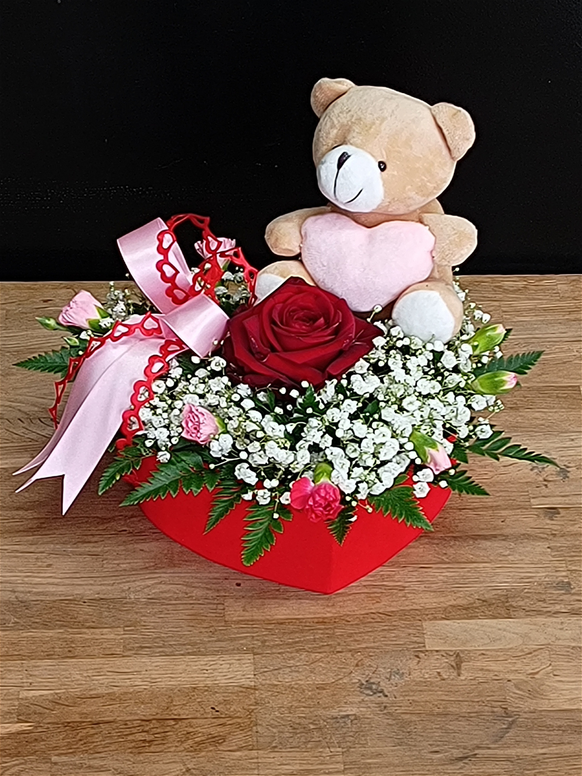 A delightful surprise for your little Valentine. This sweet gift set featuring a cute Teddy Bear and a beautiful single Red Rose nestled in the centre, accompanied by Gypsophila and seasonal foliage. All presented in a stylish velvet heart shaped box with a pink/red satin bow.