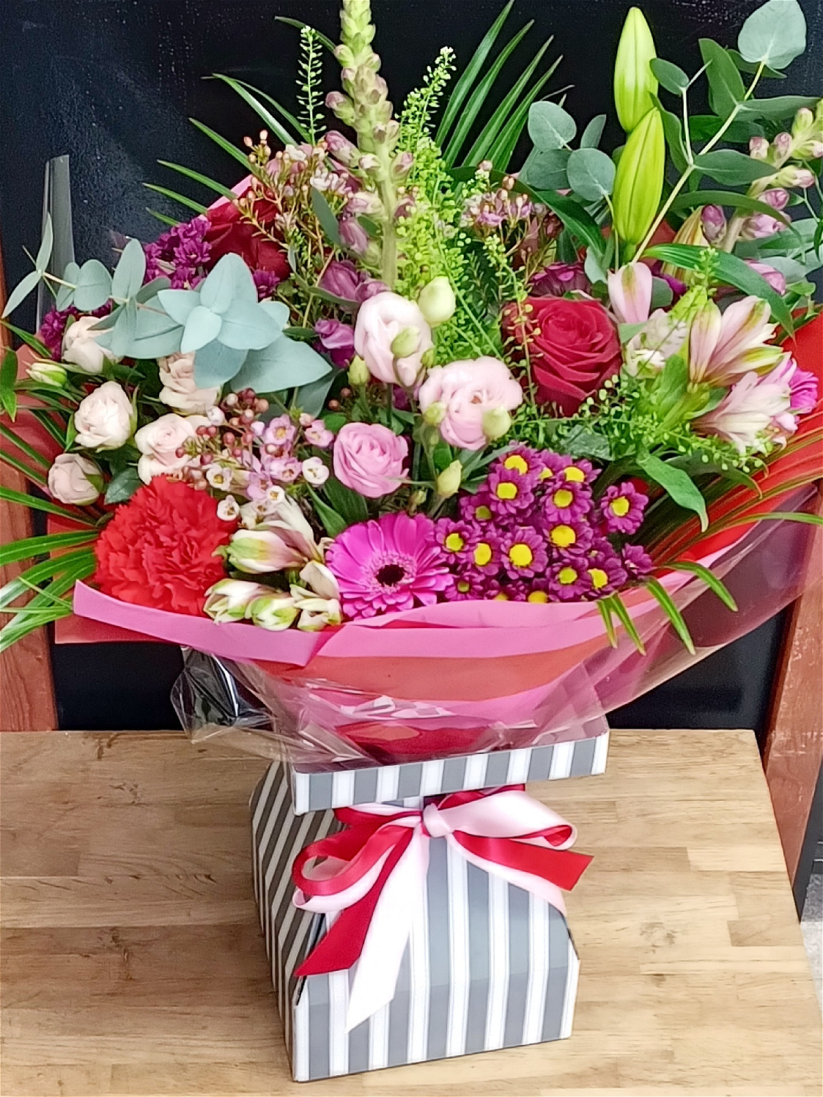 Get her heart racing this Valentine's Day with a stunning hand tied bouquet in Reds, Pinks and purples. Featuring a large headed Red Explorer Rose and Pink Lily in the centre and an abundance beautiful blooms and foliage.