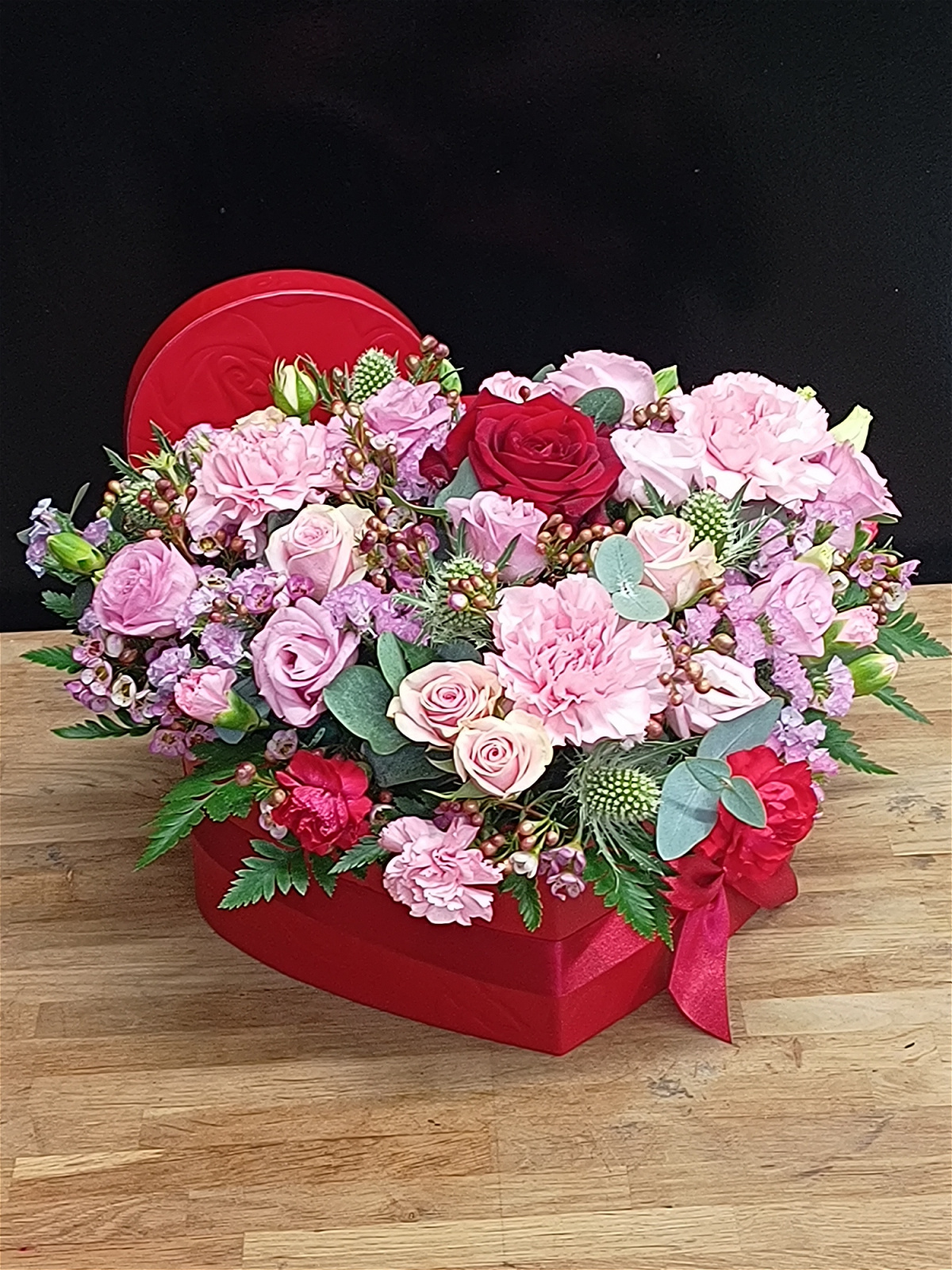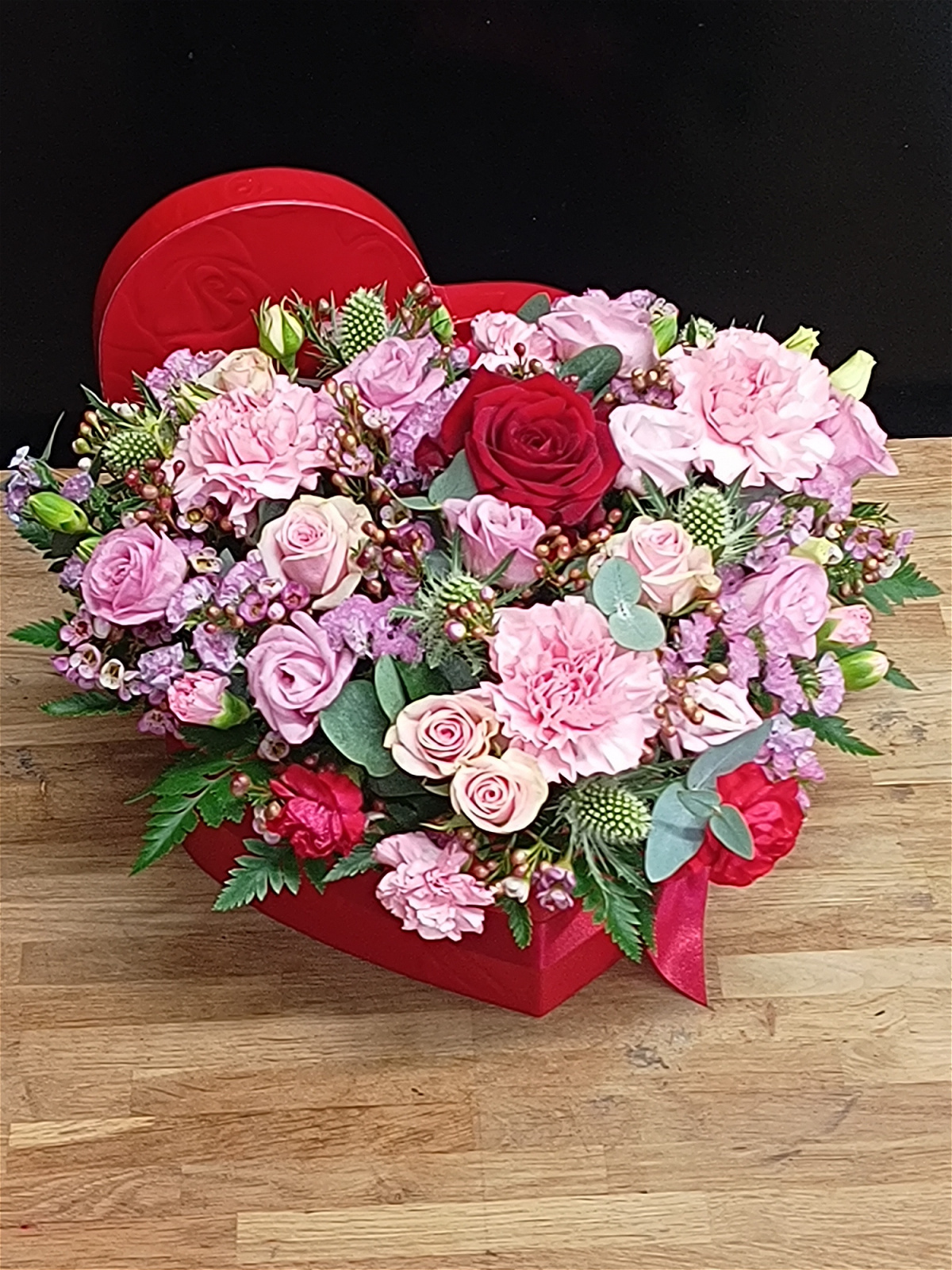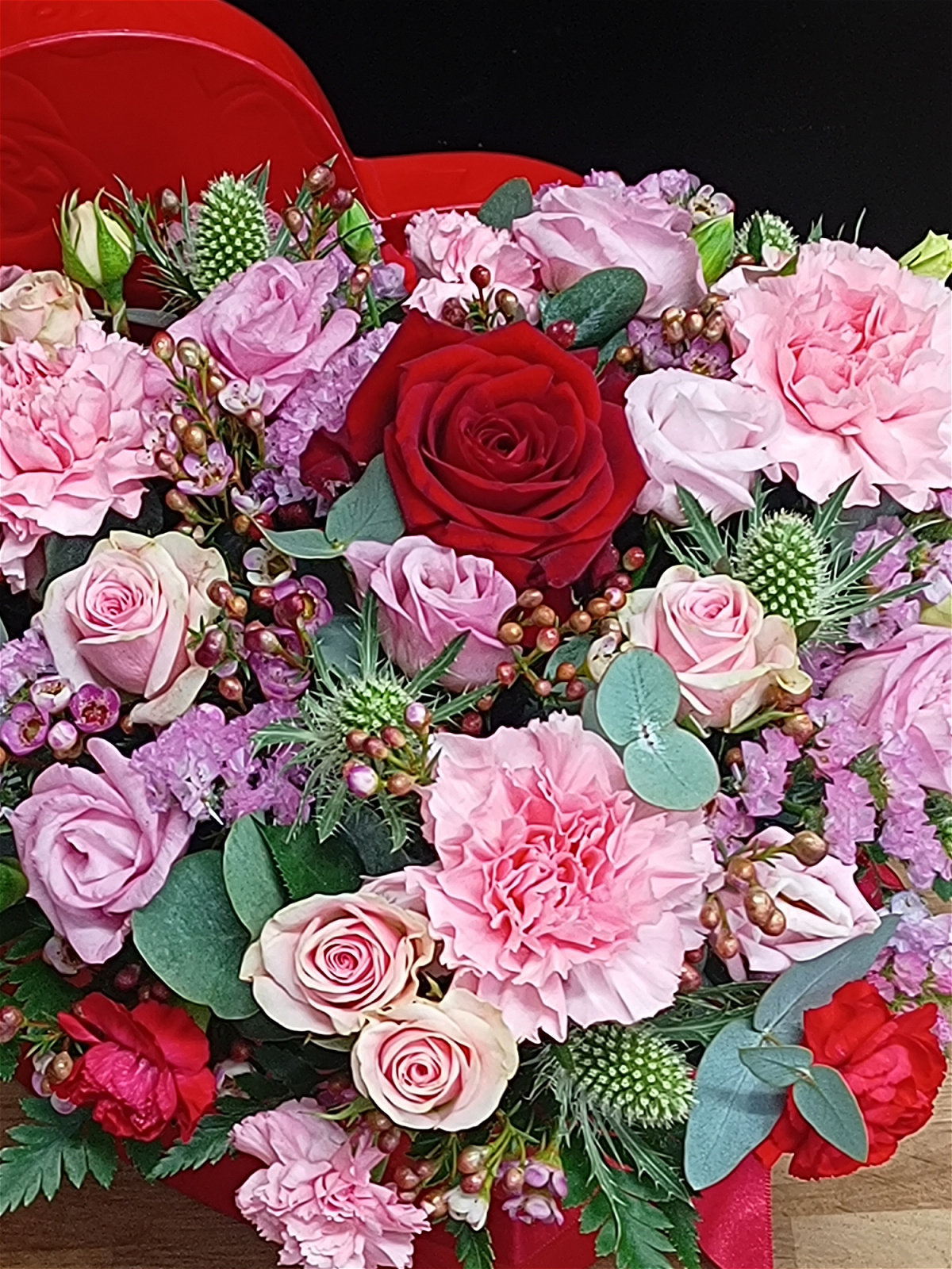 A stunning Heart Shaped Hatbox arranged with a Large Red Rose in the centre, pink standard carnations,spray roses, pink Eustoma, spray carnations and seasonal foliage.