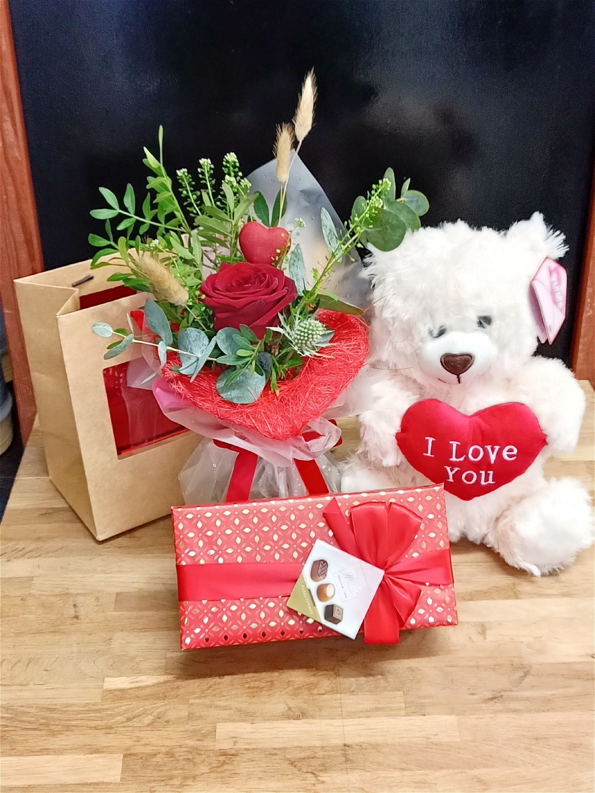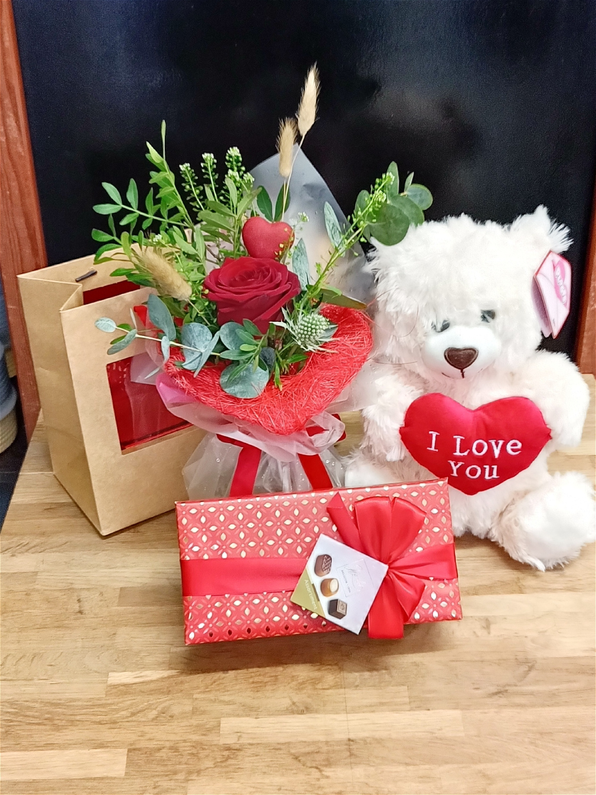 Valentines gift set containing Single Red Rose in a love heart sisal collar and gorgeous glass vase, a lovely Teddy Bear holding "I love you" heart and 250g of Hamlet Chocolate assortment. Delivered in a lovely Kraft bag.