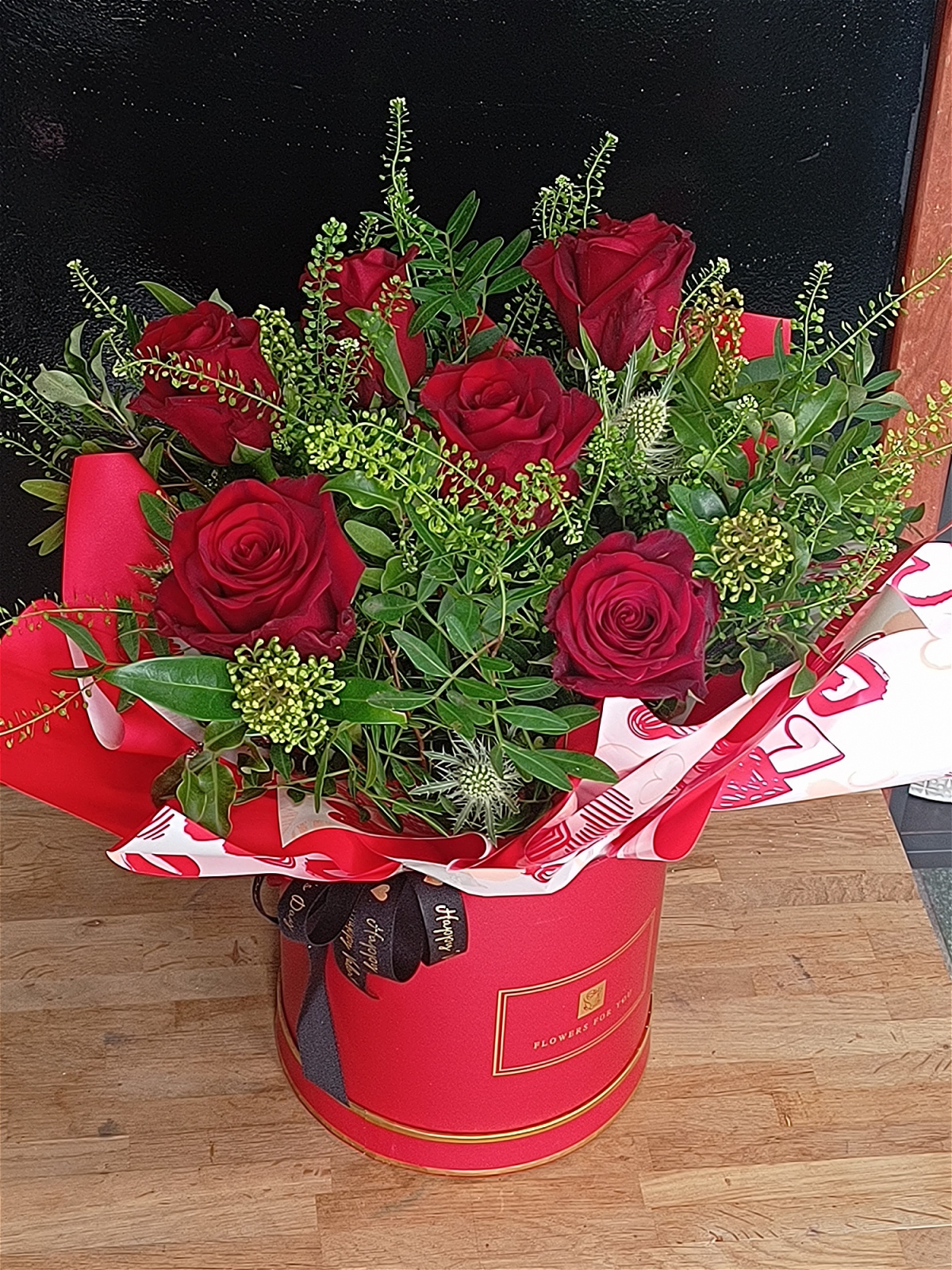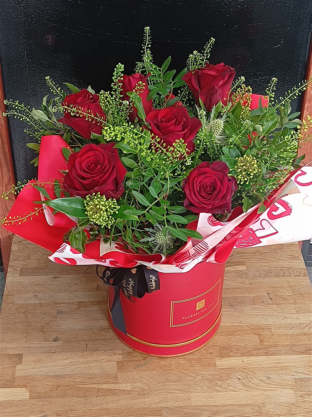 Featuring luxury large headed Red Explorer Roses, complimented with a lush foliage, this design feels timeless with a contemporary edge. Arranged in a red box within Oasis, wrapped in sleek Valentine's cellophane, it's a perfect way to say "I love you"